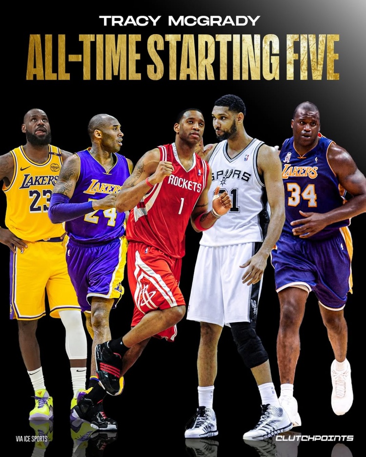 麥迪說道:“我選擇勒布朗當控衛,科比得分後衛。我去打三號位,鄧肯四號位,奧尼爾五號位。沒有不尊重任何人,這就是我的五人組。“