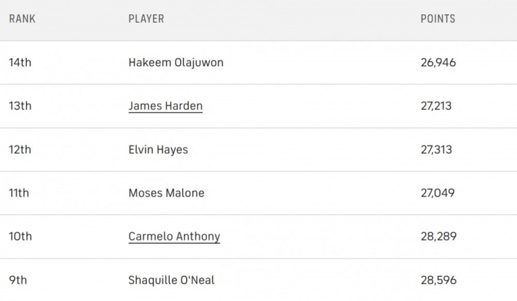 哈登目前領先庫裏2000多分,並且仍然是現役球員。哈登自己很可能也會進入曆史得分榜前十名,或許就在下賽季,而庫裏幾乎不可能追上哈登,這意味著庫裏還需要超越奧尼爾才能進入前十名。