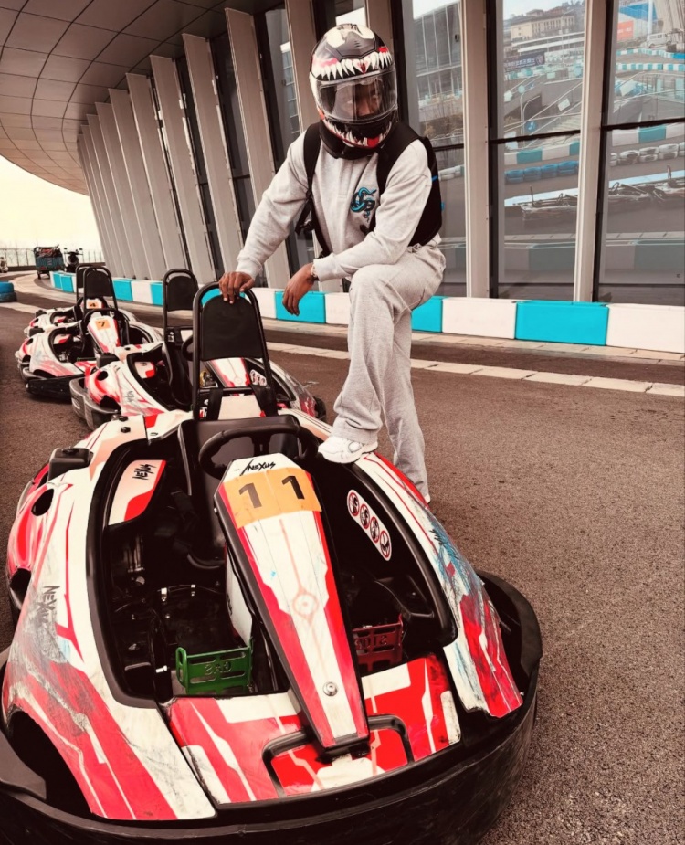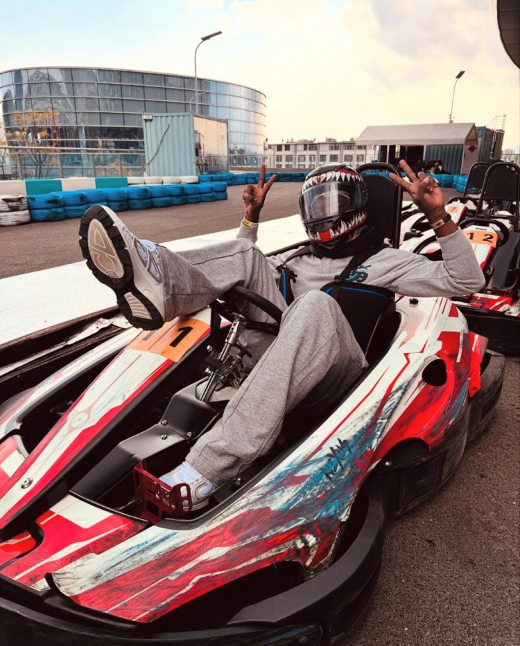 各種pose擺個不停,小奧斯卡社媒曬與賽車合影